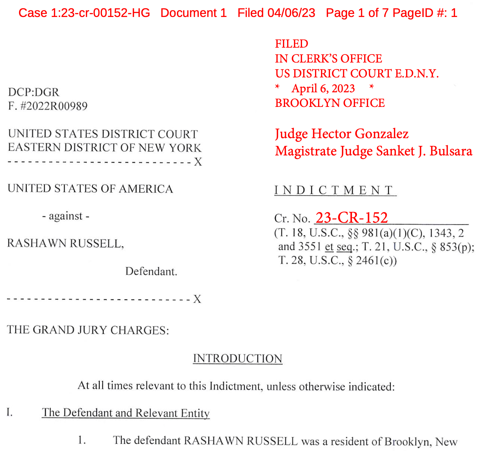 Прокуратура предъявила Расселу обвинение по пунктам, связанным с криптовалютой, в апреле 2023 года. В сентябре он признал себя виновным по всем пунктам обвинения.