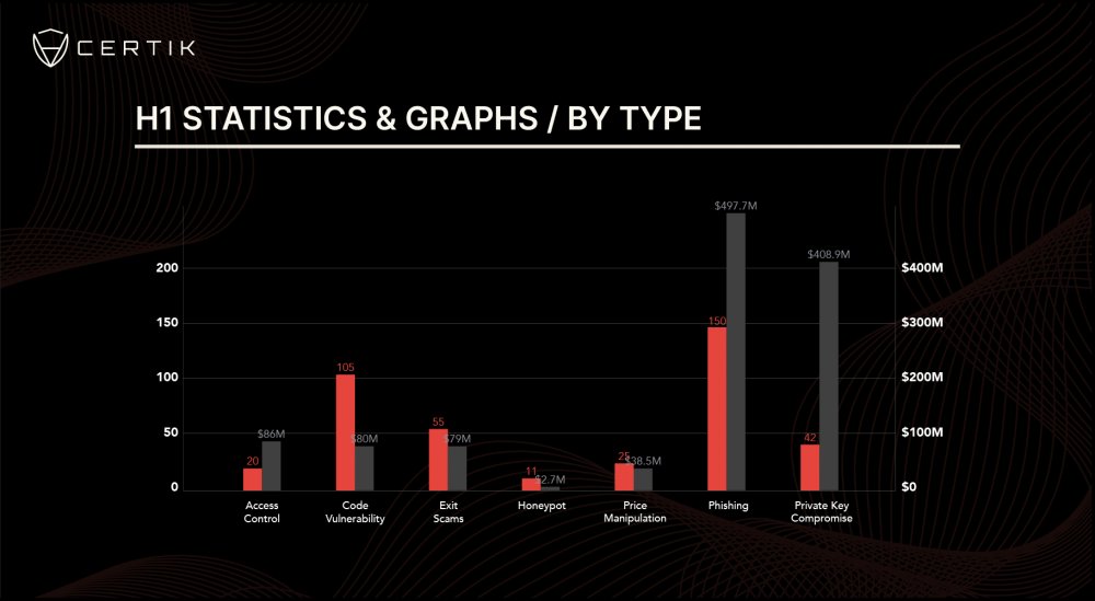 В отчете подчеркивается, что большая часть потерь была связана с фишинговыми атаками и компрометацией закрытых ключей, при этом фишинговые атаки привели к потере почти 498 миллионов долларов.