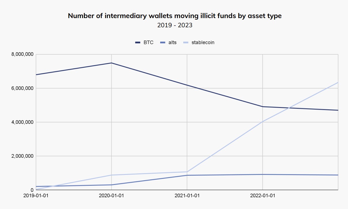 Число перемещающих незаконные средства кошельков в разбивке по типу актива. Источник: Chainalysis.