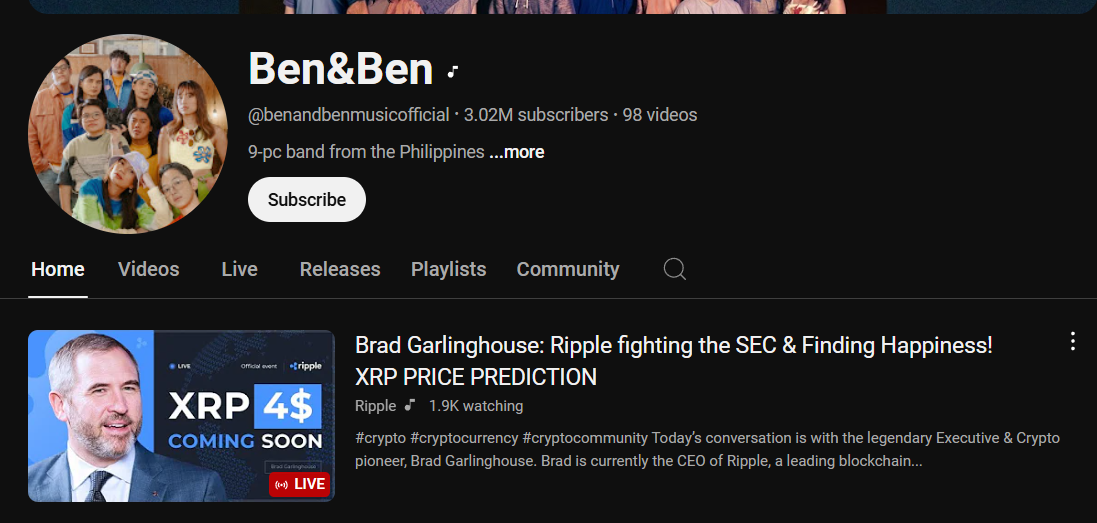Аккаунт Ben&Ben рекламирует мошенничество с XRP. Источник: YouTube.