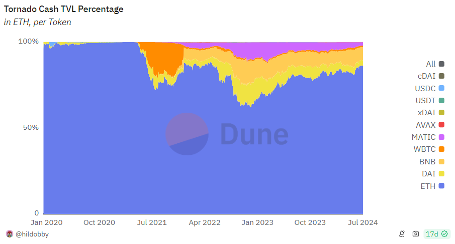 Наиболее популярным активом на площадке остается Ethereum (ETH). Его доля превышает 80%, согласно Dune Analytics: