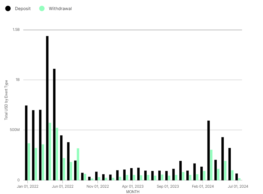 Как видно на графике ниже, лидером по объему депозитов стал март. В этом месяце в сервис внесли $593,9 млн, вывели — $302,7 млн.