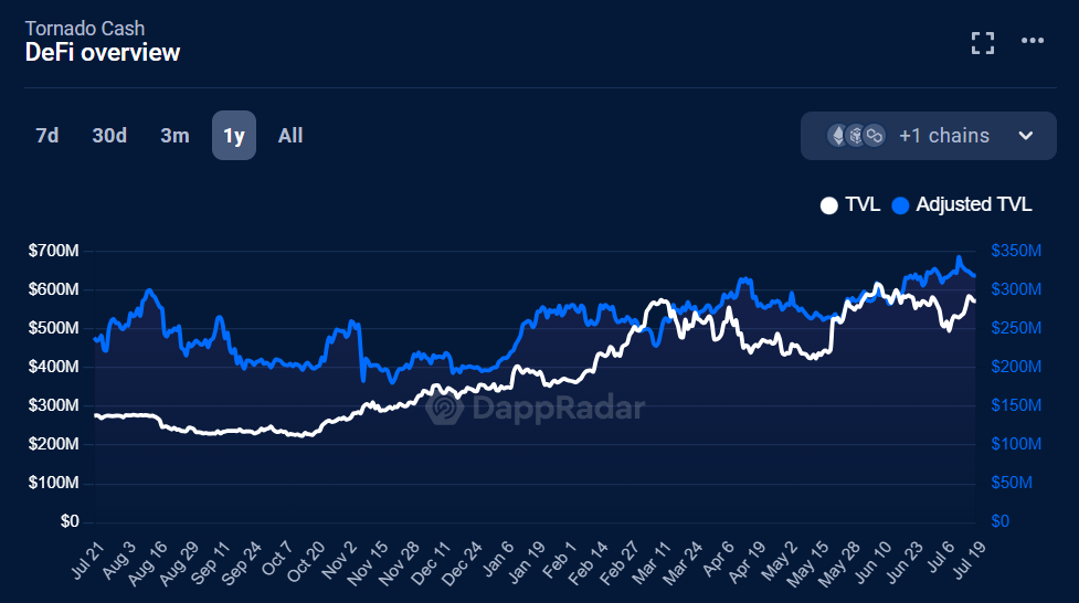 На повышение активности на ресурсе указывает также изменение показателя общей заблокированной стоимости (TVL). С начала 2024 года он вырос с $350 млн до $580 млн по состоянию на июль:
