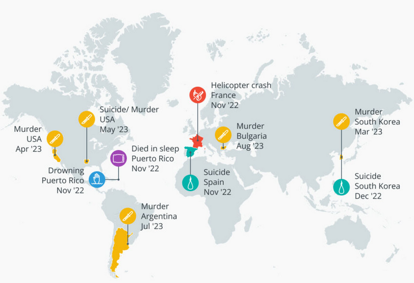 Смерти, связанные с криптовалютой, по всему миру в период с ноября 2022 года по сентябрь 2023 года.