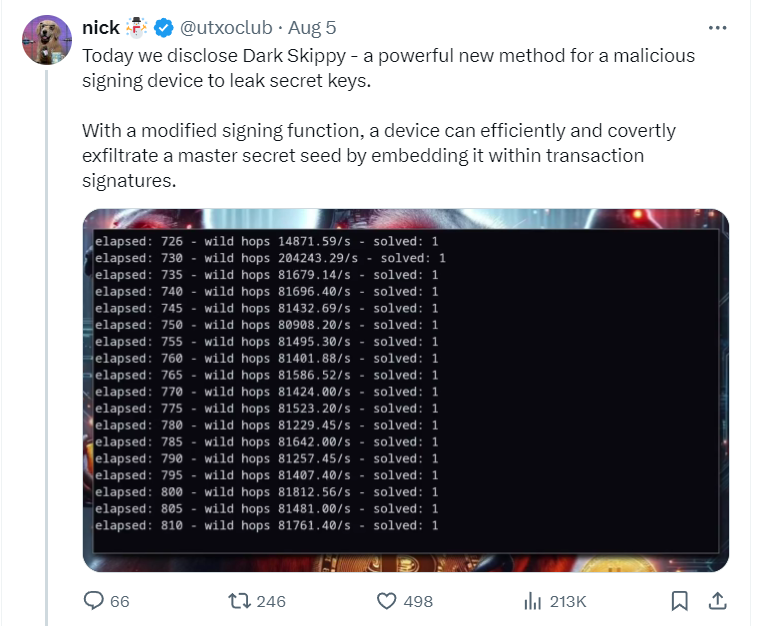 Отчет о раскрытии информации был опубликован Ллойдом Фурнье, Ником Фэрроу и Робином Линусом 5 августа. Фурнье и Фэрроу являются соучредителями производителя аппаратных кошельков Frostsnap, а Линус является соразработчиком протоколов Bitcoin ZeroSync и BitVM.
