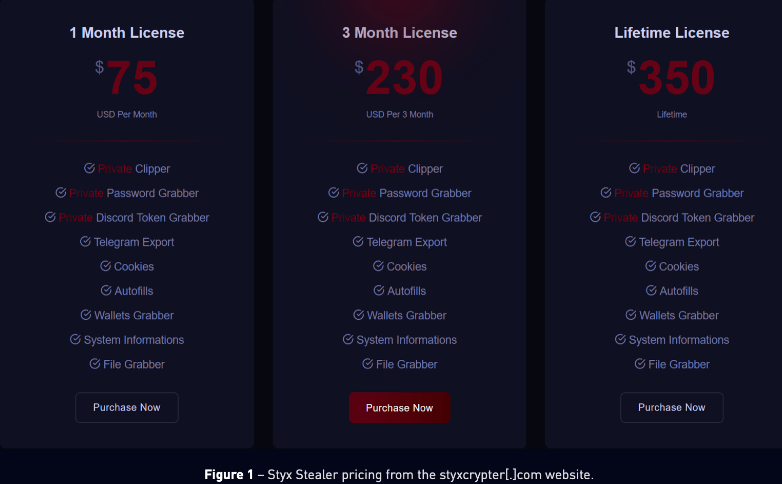 Специалисты выяснили, что ПО было запущено в апреле 2024 года и его лицензированную версию можно было приобрести на сайте styxcrypter за $75 в месяц или за $350 на неограниченный срок.