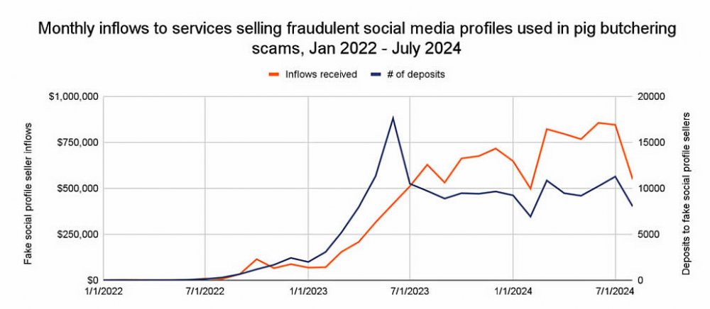 Кроме того, 43% годовых мошеннических поступлений ушли на кошельки, которые стали активными в 2024 году, что говорит о всплеске новых мошенничеств, многие из которых связаны с забоем свиней. В отчете отмечено: