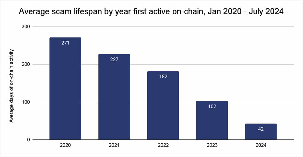 Средняя продолжительность жизни криптомошенничеств значительно сократилась: с 271 дня для мошенничеств, начавшихся в 2020 году, до 42 дней для мошенничеств, начавшихся в 2024 году.
