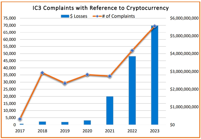 Количество обращений, связанных с криптовалютами, составило примерно 10% от общего числа жалоб на финансовые мошенничества. Но убытки, связанные с этими 10%, достигли почти половины общих потерь.