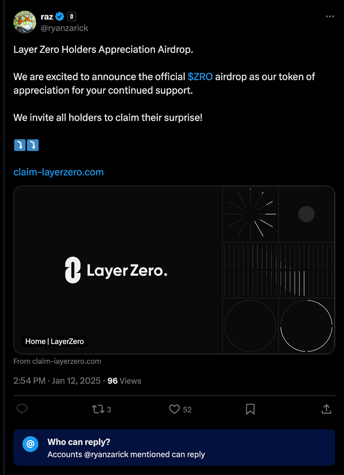 Через аккаунт технического директора LayerZero Labs Райана Зарика злоумышленники анонсировали аирдроп.