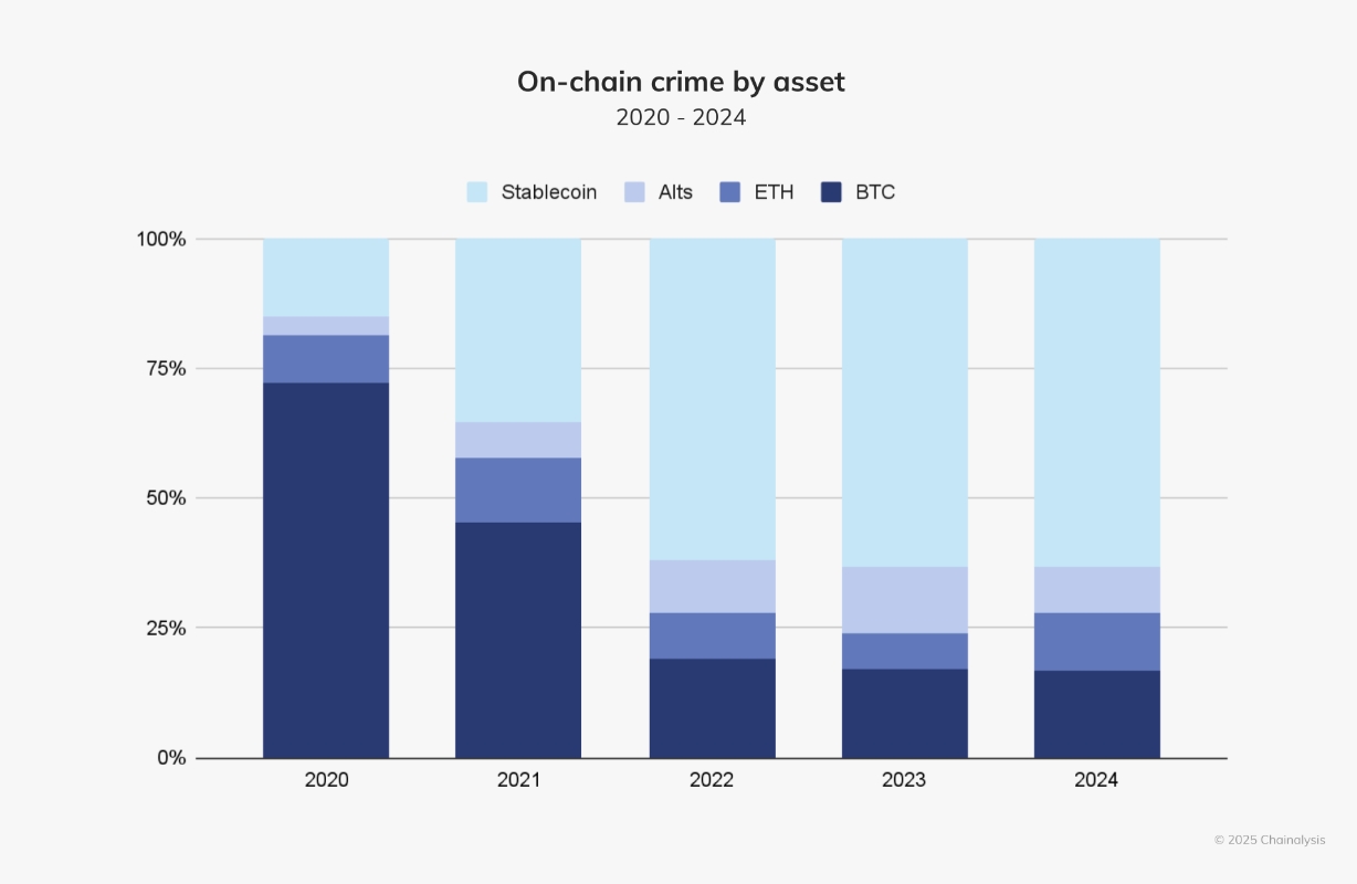 Доля разных видов криптовалют, используемых в незаконных транзакциях, за последние три года существенно не изменилась. В 2024 году 63% из таких переводов были совершены в стейблкоинах, оставшуюся часть транзакций поделили практически поровну биткоин и альткоины. Примерно та же картина наблюдалась в 2022 и 2023 годах. Анонимная криптовалюта Monero (XMR) в отчет включена не была.