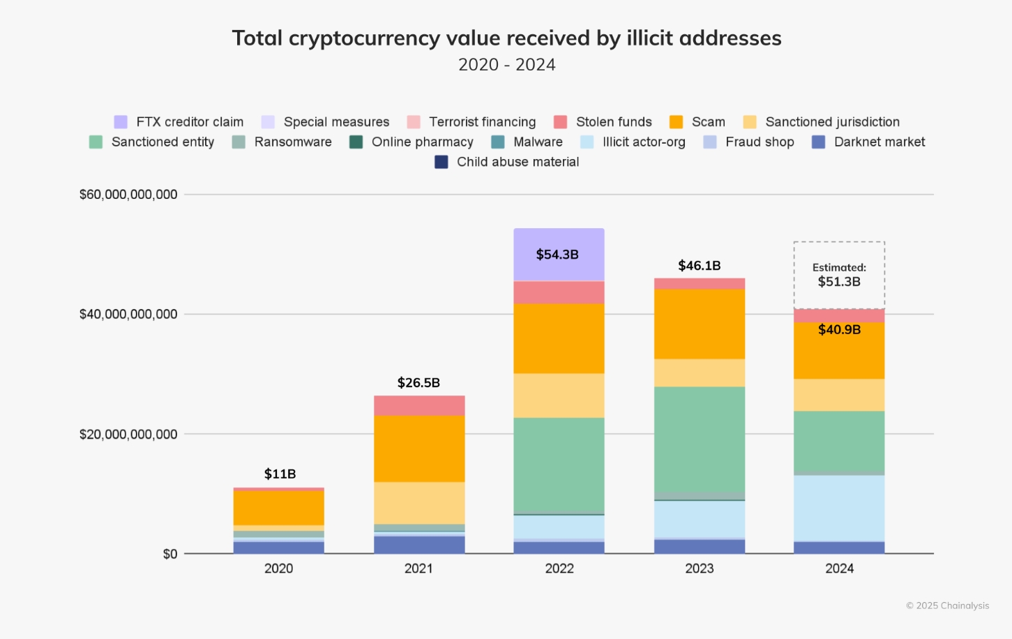 Сумма в $40,9 млрд — это предварительная оценка, основанная на данных, имеющихся у аналитиков на текущий момент. По мере того, как будут выявляться больше адресов, помеченных как незаконные, связанные с ними транзакции за 2024 год будут включены в итоговую сумму. По прогнозу Chainalysis, через год она может достигнуть $51 млрд.