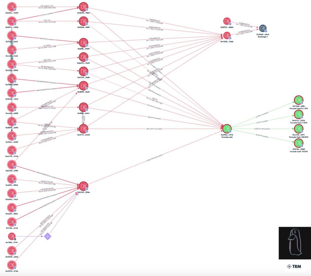 Эксперт пояснил, что похищенные средства перевели из блокчейна Sui в Ethereum через посредников, а затем отправили в криптомиксер Tornado Cash партиями.