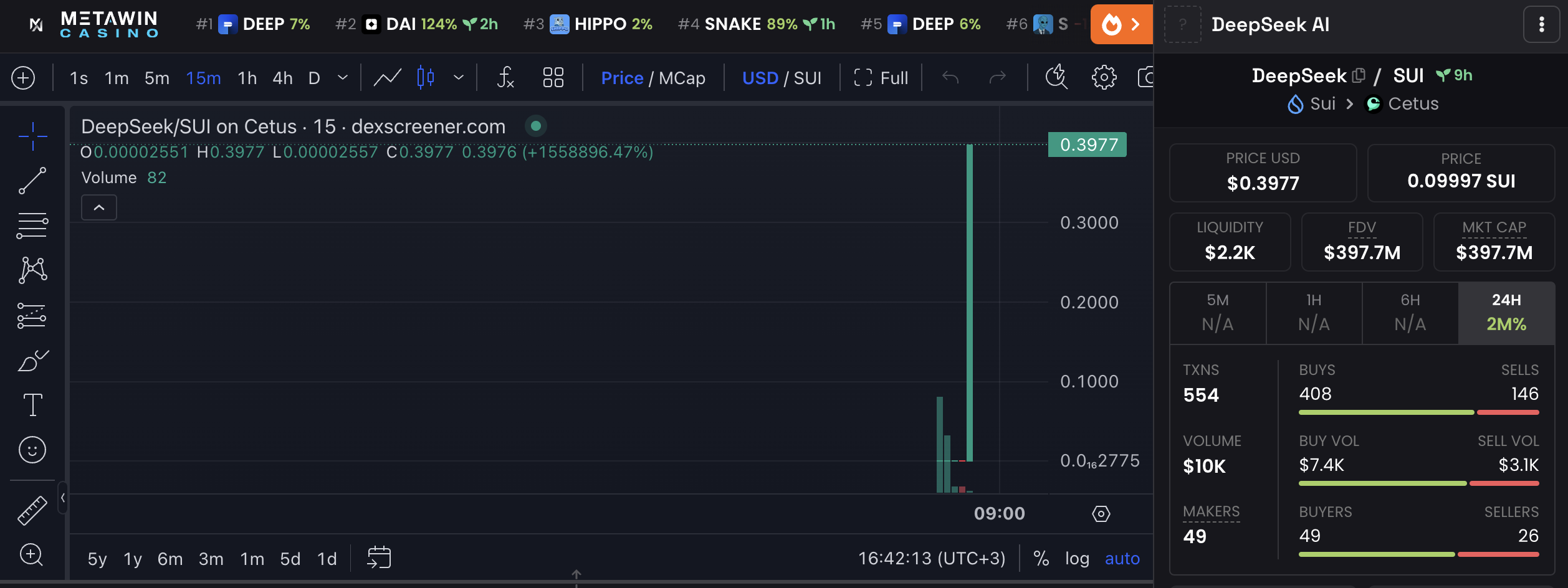 Теперь скамеры создают монеты, якобы связанные с китайским ИИ-стартапом DeepSeek. Капитализация одной из таких криптовалют на базе Sui уже достигла $397 млн, по данным DEX Screener.