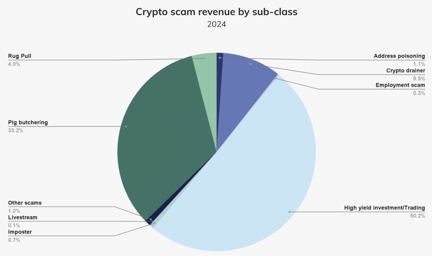 В 2024 году основными видами мошенничества стали схемы с высокой доходностью (50,2% всех украденных средств) и так называемый «свиной убой» (pig-butchering) — 33,2%. Примечательно, что доходы от первого типа мошенничества снизились на 36,6% по сравнению с прошлым годом, тогда как второй показал рост почти на 40%.