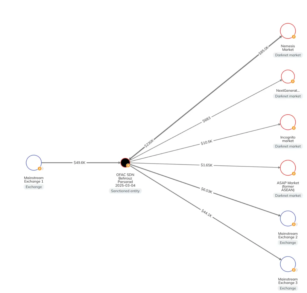 Большая часть объема транзакций Парсарада приходится на Nemesis, но он также отправил более 12 000 долларов США на несколько других торговых площадок даркнета, таких как ASAP Market, Incognito Market и Next Generation, и «косвенно использовал миксеры», согласно данным компании, занимающейся блокчейна-аналитикой.