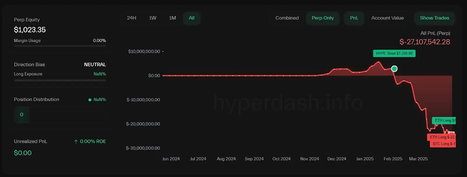 «Мошенник ZkCasino, который выманил более 40 млн долларов, закрыл свою позицию $ETH (20x) на Hyperliquid, столкнувшись с общим убытком в размере 27,1 млн долларов», — добавил он.