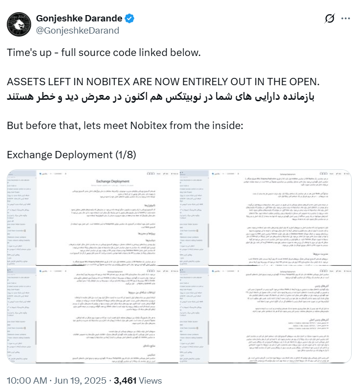 «Время вышло — полный исходный код приведен ниже. АКТИВЫ, ОСТАВШИЕСЯ В NOBITEX, ТЕПЕРЬ ПОЛНОСТЬЮ ОТКРЫТЫ», — заявила группа в своем посте X.