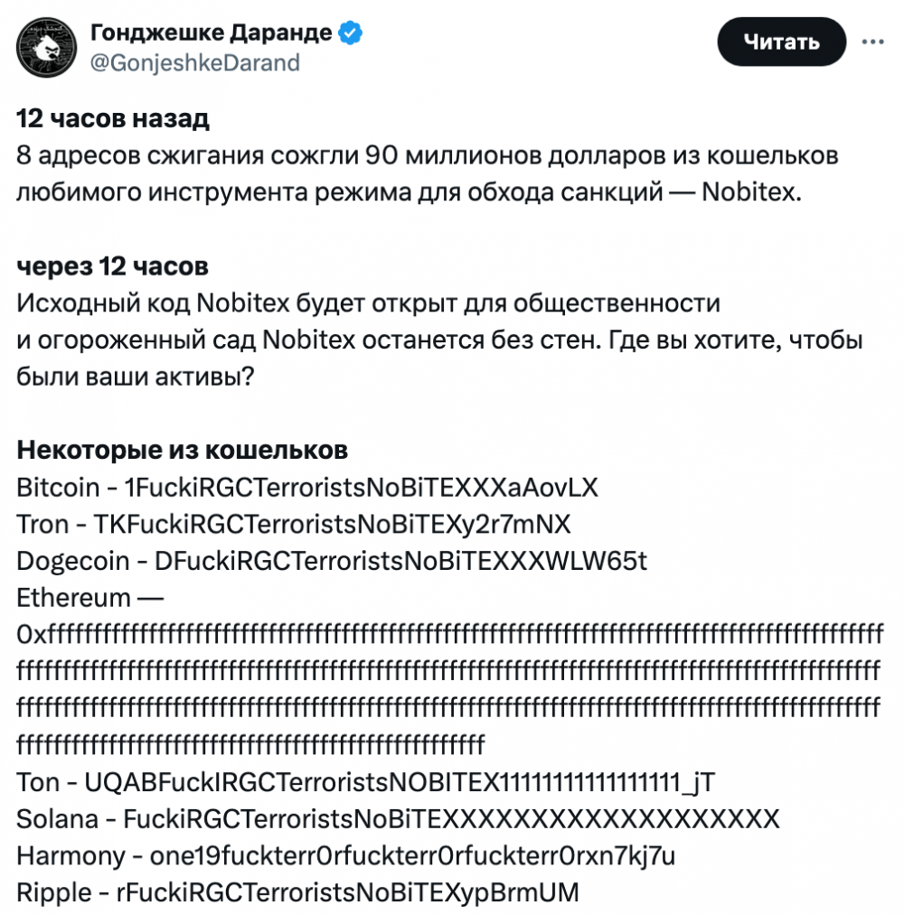 Хакеры заявили, что выбрали Nobitex как цель, поскольку биржа связана с правительством Ирана и помогает обходить международные санкции.