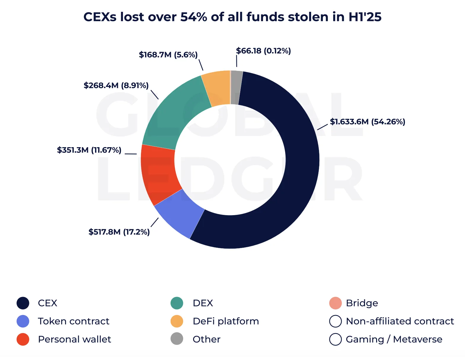 Централизованные биржи (CEX) — главные мишени киберпреступников. В первом полугодии на них пришлось 54,26% потерь — $1,63 млрд.