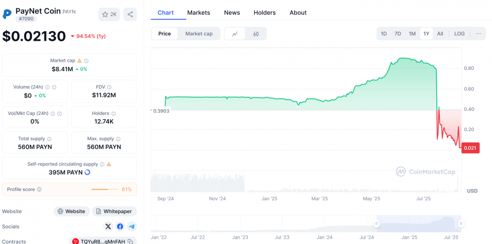Цена монеты PayNet на CoinMarketCap. Источник: CoinMarketCap
