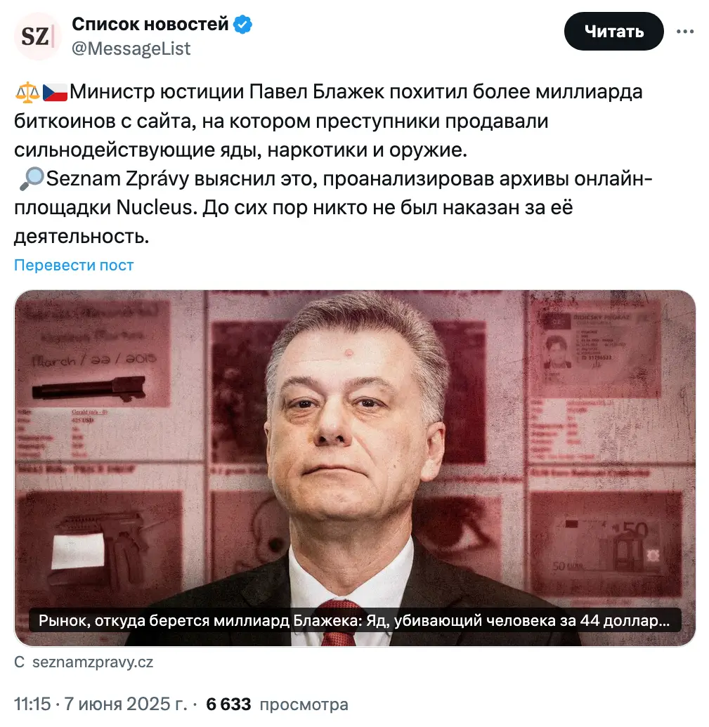 Скандал с министром Блажеком разразился в мае, когда стало известно о получении им биткоинов от осужденного преступника. Издание Seznam Zprávy связало перевод 468 BTC с даркнет-площадкой Nucleus, на счетах которой находилось около 5000 BTC.