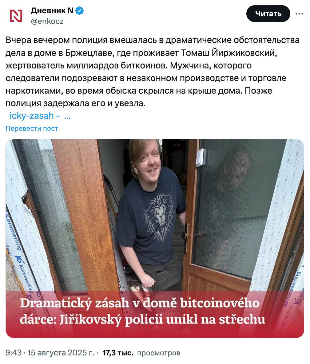 Чешская полиция арестовала Томаша Йиржиковского в четверг вечером (перевод Grok). Источник: Deník N
