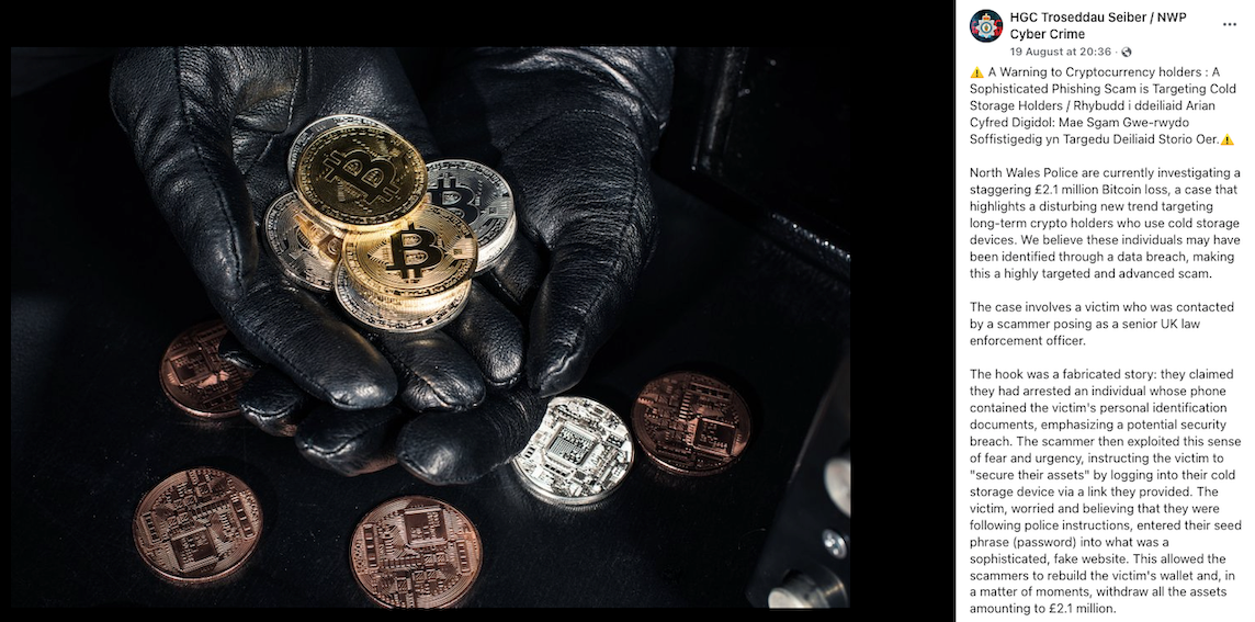 Полиция Северного Уэльса заявила, что работает над отслеживанием и возвратом средств, и разъяснила владельцам криптовалюты, как убедиться в подлинности обращений от правоохранительных органов и какие вопросы полиция действительно может задавать.
