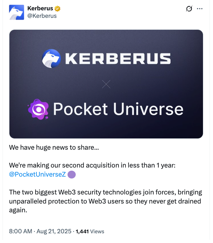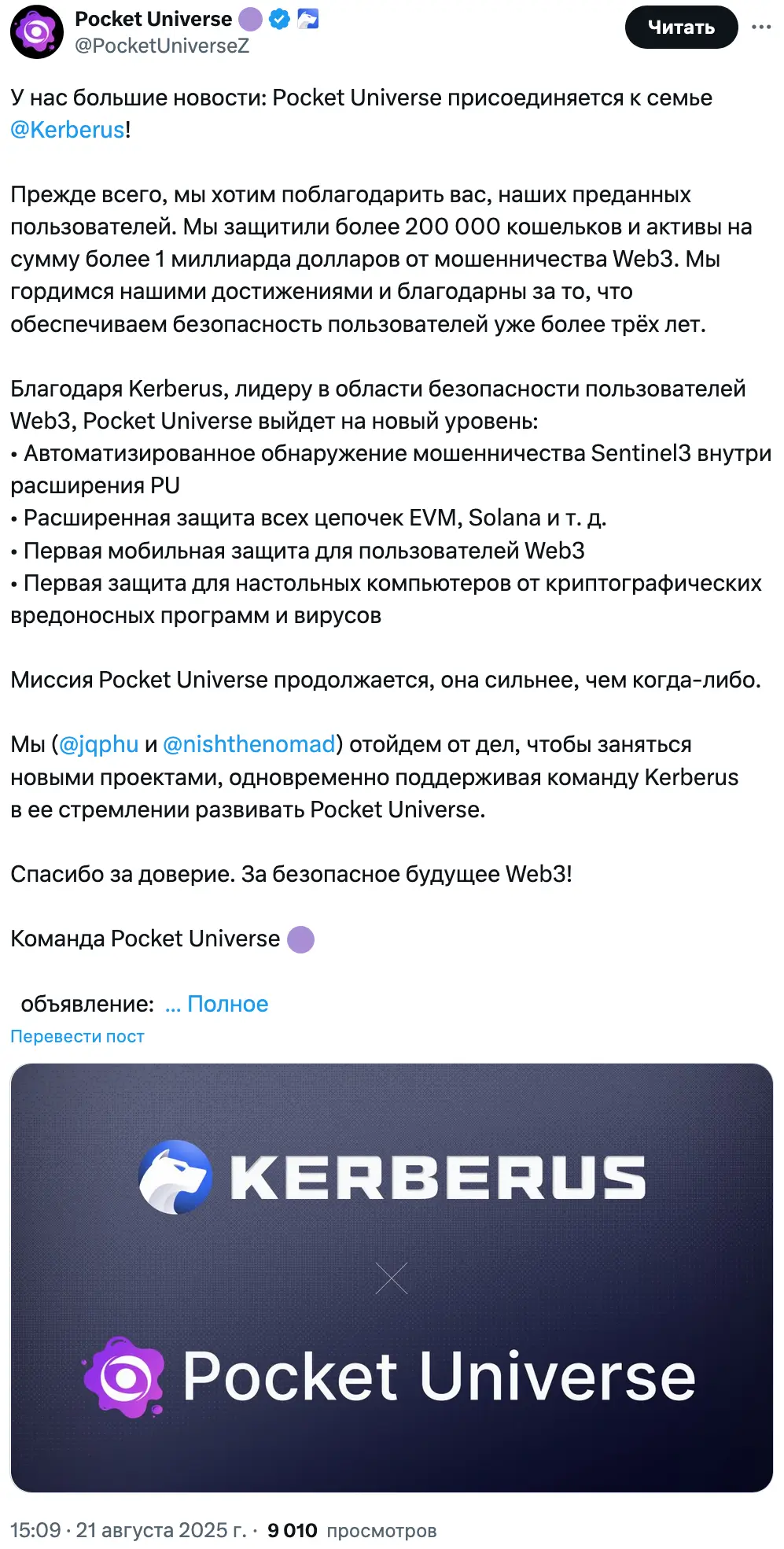 Криптовалютная платформа Kerberus приобрела Pocket Universe, популярное браузерное расширение для предотвращения мошенничества, чтобы создать специализированный антивирус для криптовалют.