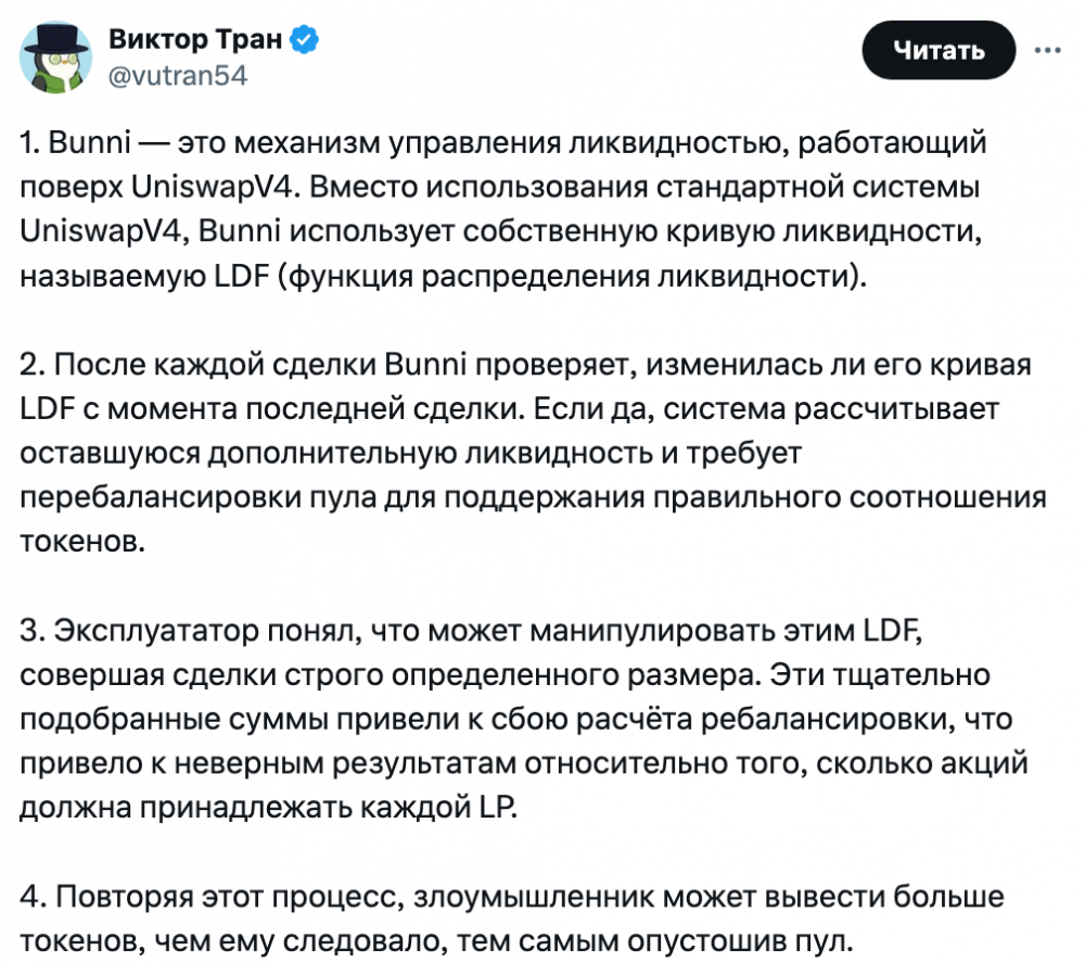 Хотя техническое расследование еще не завершено, предварительный анализ, проведенный разработчиками и исследователями, указывает на ошибку в том, как Bunni обрабатывает перебалансировку ликвидности.