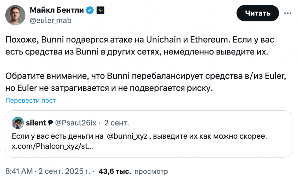 «Приложение Bunni подверглось атаке безопасности», — подтвердила команда проекта на платформе X во вторник.