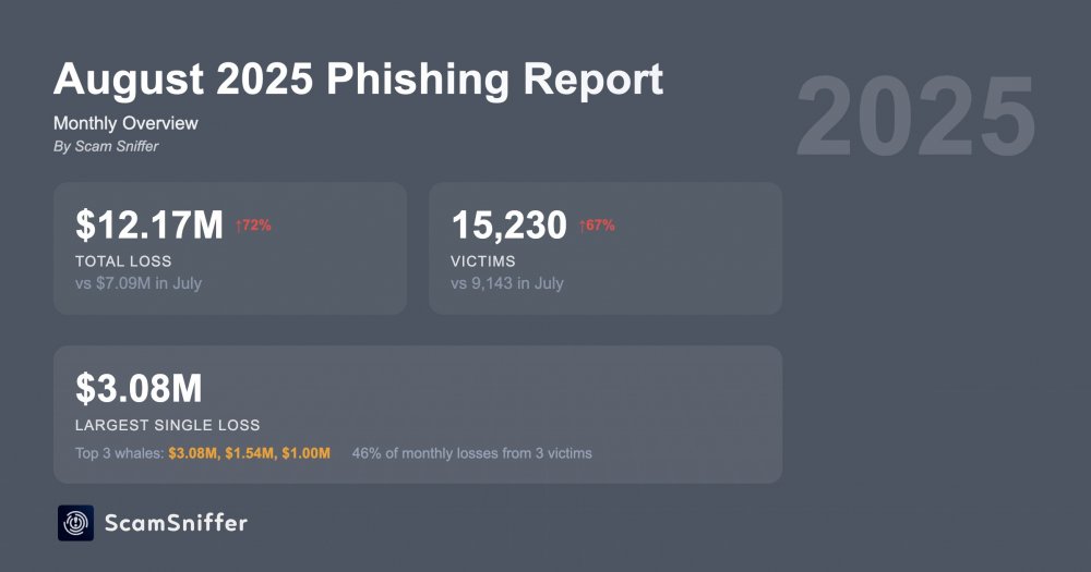 По данным Scam Sniffer, от фишинга криптовалют в августе пострадали 15 230 человек, что на 67% больше, чем в июле. Самый крупный убыток, понесенный одним пользователем, составил более 3 миллионов долларов.