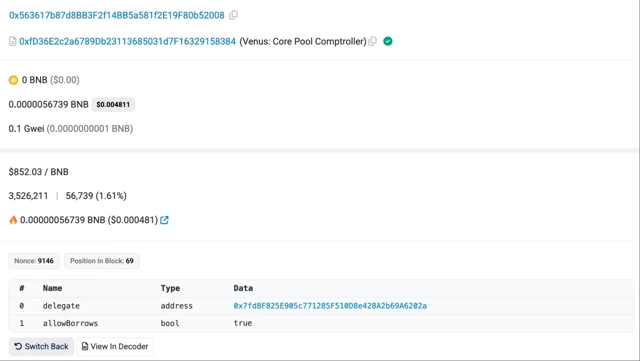 Чтобы рассчитаться по флэш-кредиту, он снова внес часть активов в Venus и взял в долг BTCB.