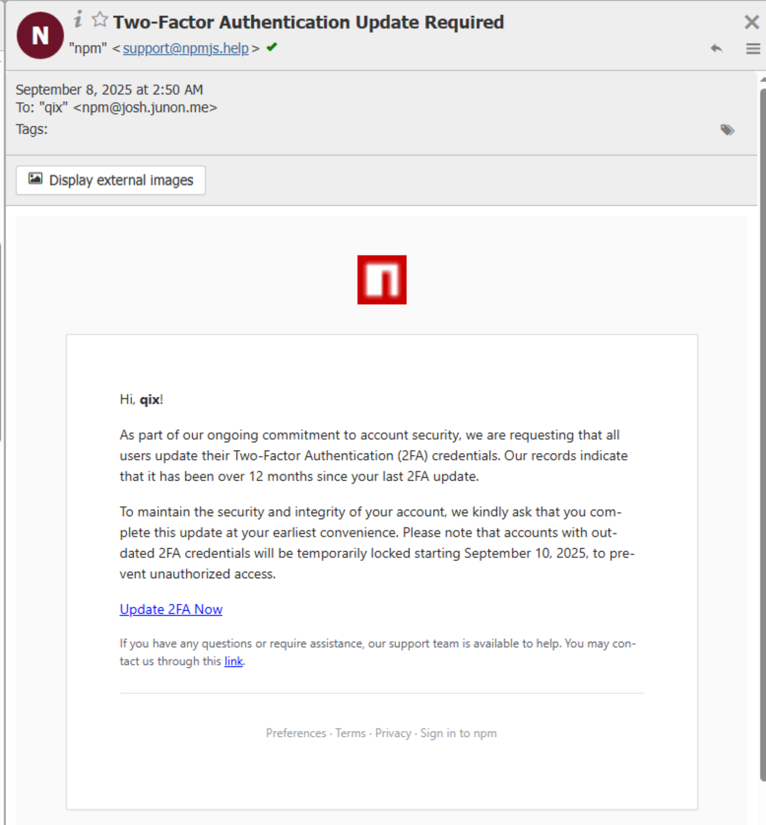 Злоумышленники рассылали письма от имени официальной службы поддержки NPM, предупреждая администраторов о блокировке их учетных записей, если они не «обновят» двухфакторную аутентификацию до 10 сентября.