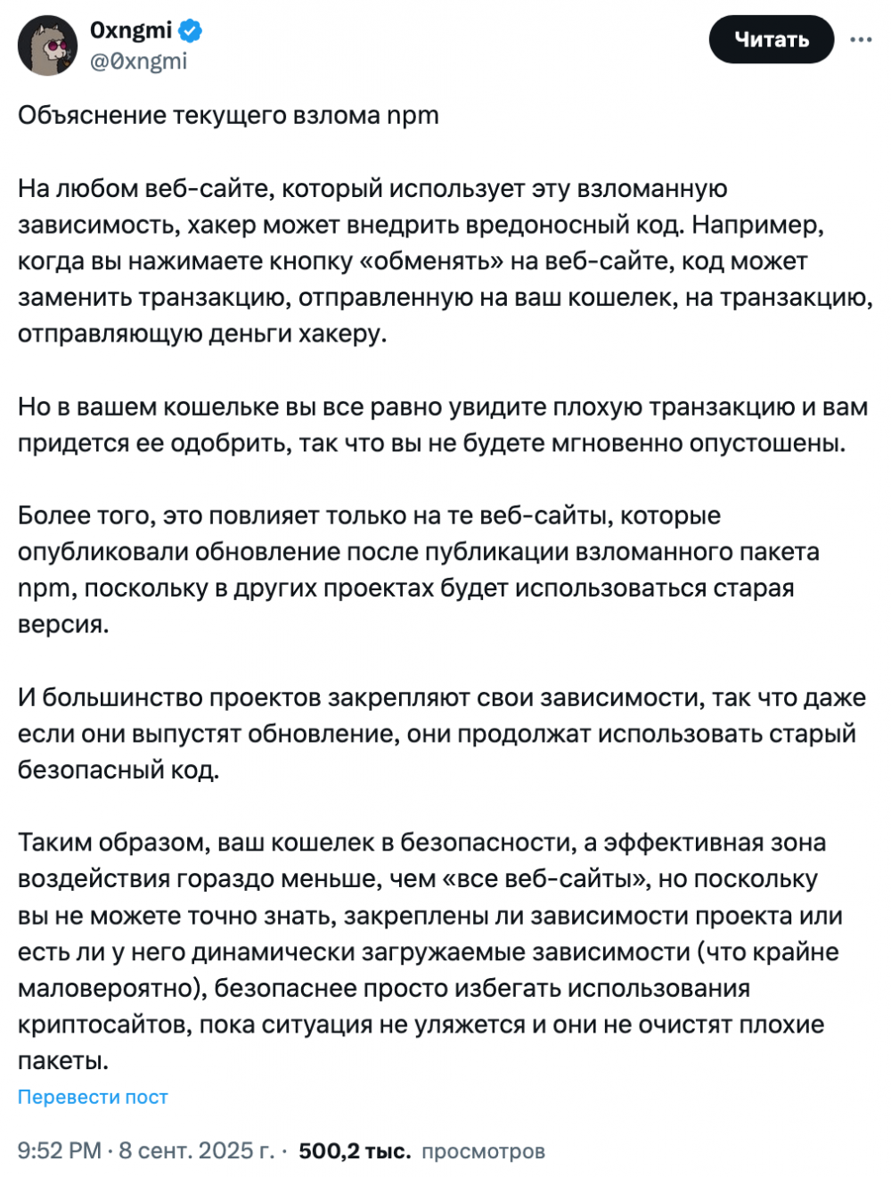 Согласно сообщению на X основателя DefiLlama 0xngmi, вредоносный код не опустошает кошельки автоматически — пользователям все равно придется одобрить некорректную транзакцию.