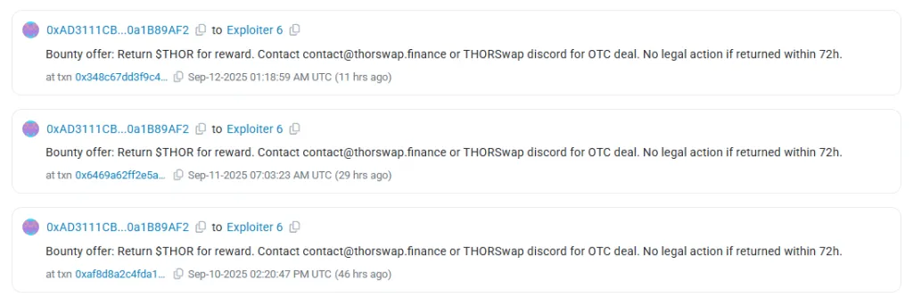 12 сентября THORChain начала рассылать ончейн-сообщения на адрес злоумышленников с просьбой вернуть средства за вознаграждение.