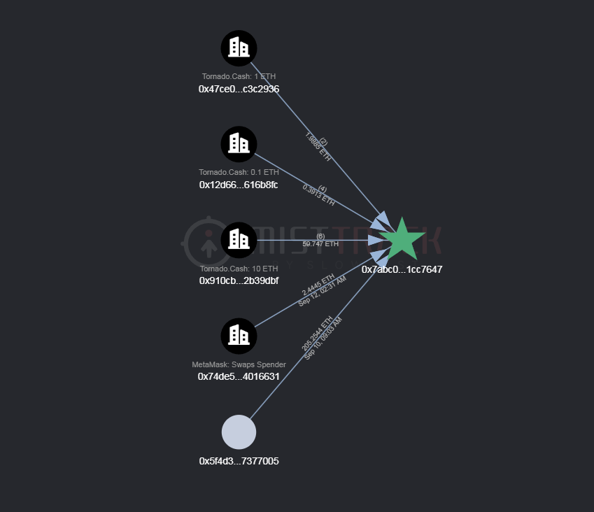 В дальнейшем часть средств была конвертирована в ETH. В общей сложности было получено более 1 600 ETH, которые были распределены по 161 кошельку (примерно по 10 ETH на каждый). Некоторые из этих адресов уже перевели средства через сервис Tornado Cash.