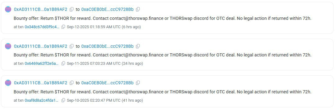 Хакеры начали активно перемещать украденные активы 9 сентября. Сначала с взломанного кошелька было выведено более 6,2 млн токенов THORChain. Почти сразу после этого они были переправлены на другой адрес, отмеченный как фишинговый.