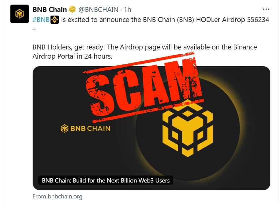 Официальная учетная запись X блокчейн-сети BNB Chain, насчитывающая почти 4 млн подписчиков, была взломана. Хакеры использовали ее для распространения фишинговых ссылок, нацеленных на криптовалютные кошельки.