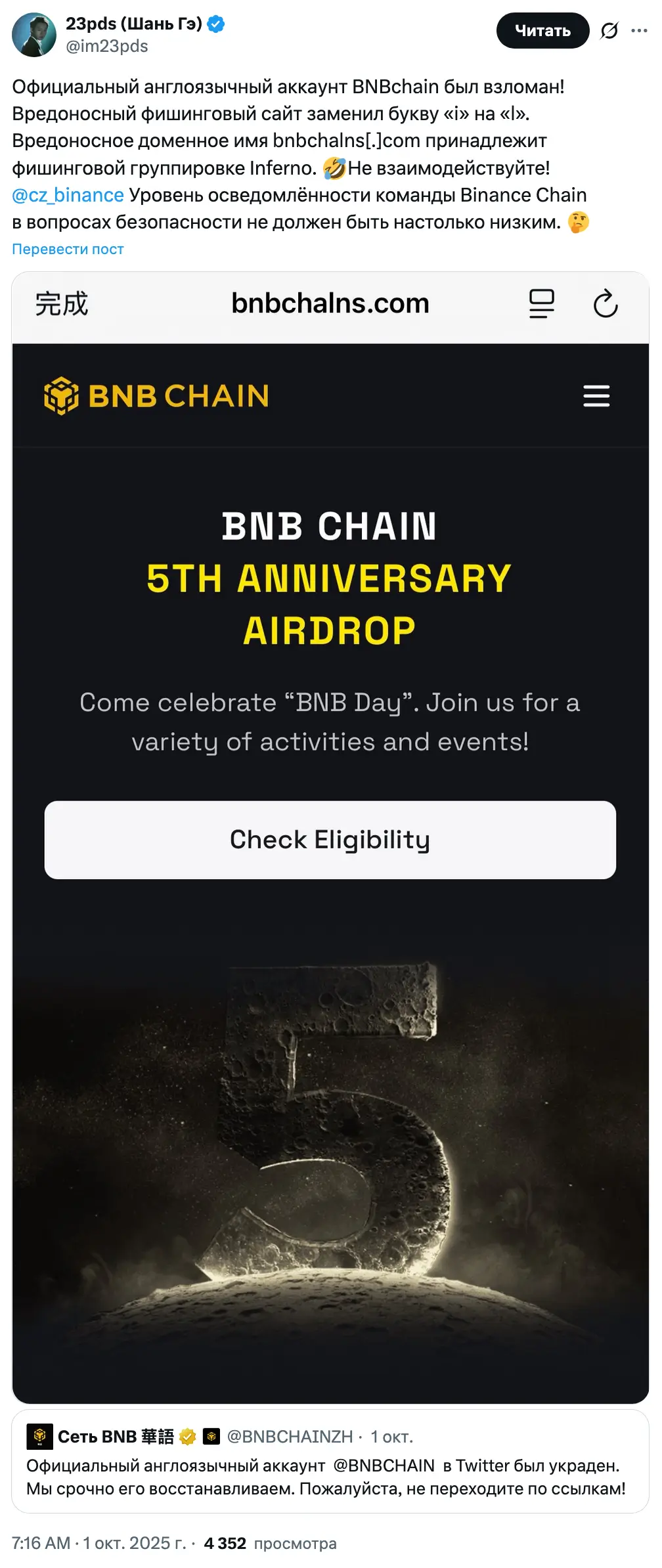 «Официальный англоязычный аккаунт BNB Chain X был взломан! Фишинговый сайт заменил букву i на l», — написал 23pds, предупреждая пользователей не поддаваться обману.