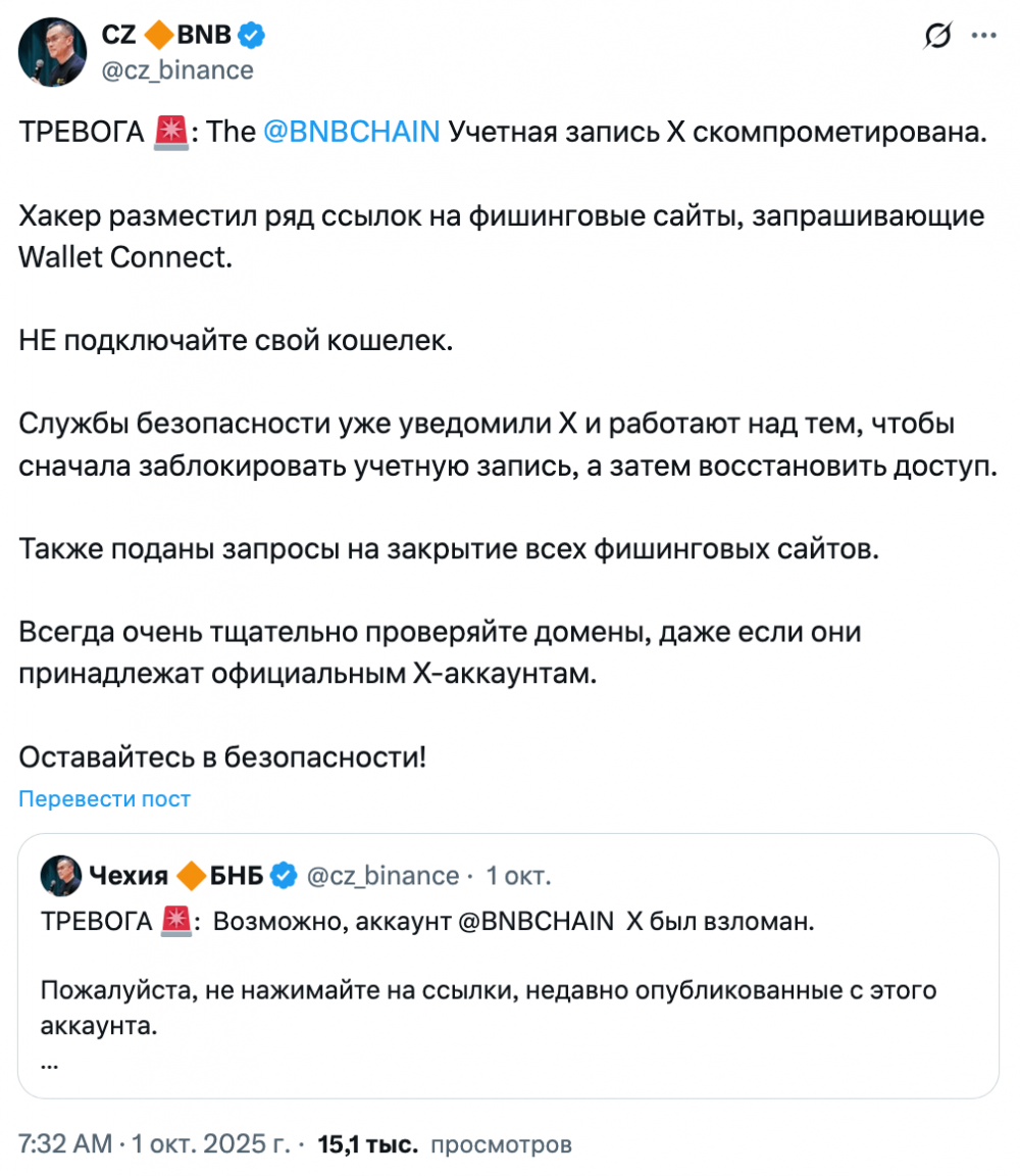 В 8:26 UTC команда BNB Chain сообщила, что восстановила контроль над аккаунтом.