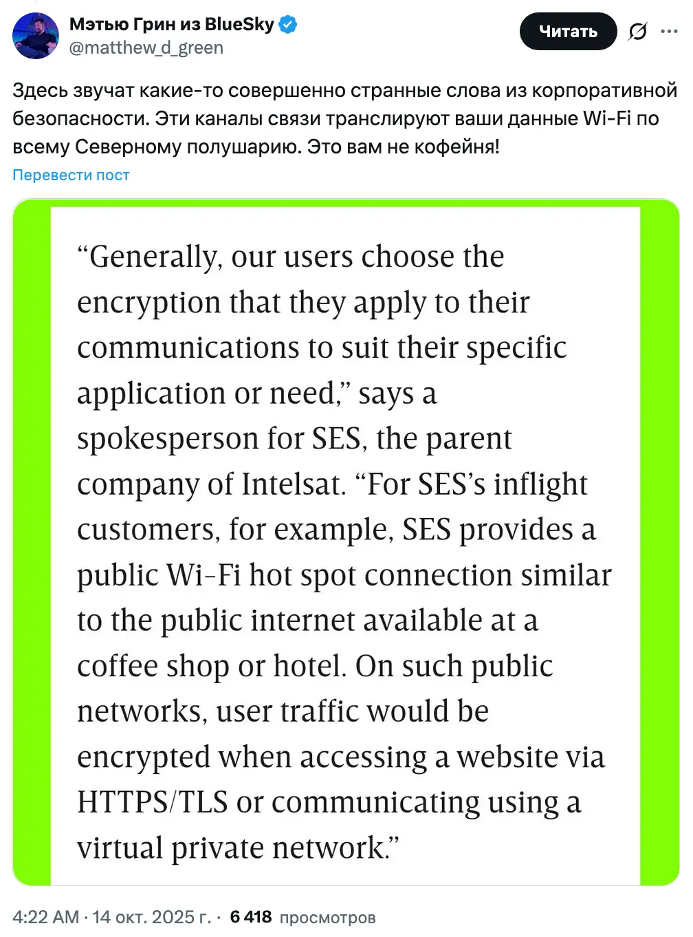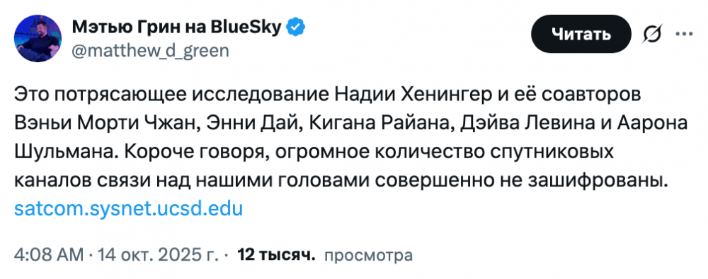 «Хотя ученые и активисты уделяют значительное внимание обеспечению практически повсеместного использования шифрования в современных веб-браузерах, спутниковым сетям связи уделяется гораздо меньше внимания», — заявили исследователи.