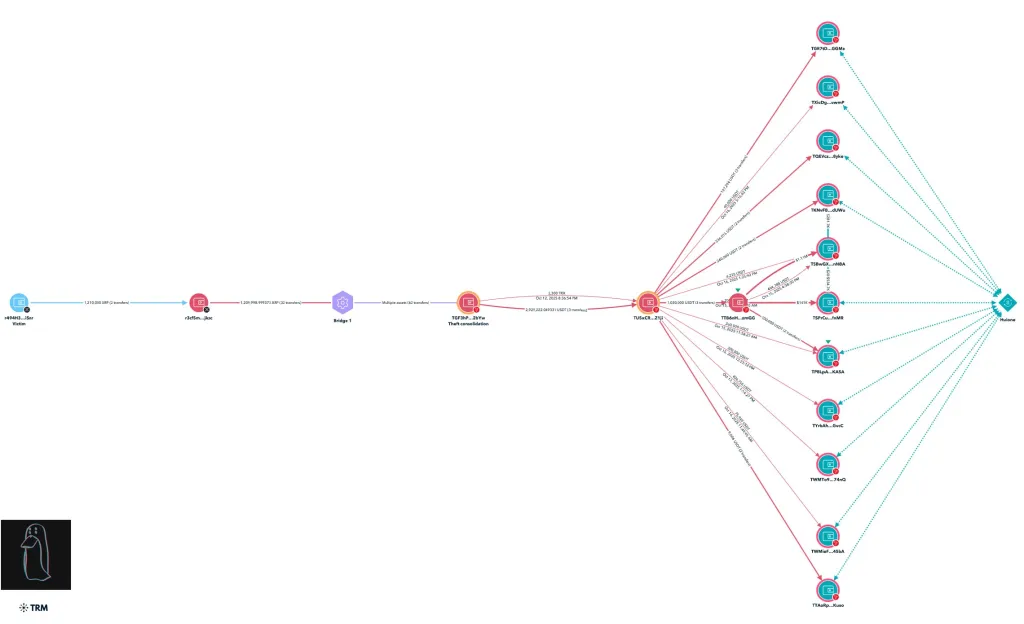 По его словам, 12 октября хакеры создали более 120 ордеров на конвертацию XRP в TRX через агрегатор Bridgers. К 15 числу мошенники консолидировали все средства в сети Tron и затем отмыли их через внебиржевые обменники, связанные с крупнейшей в мире нелегальной торговой площадкой Huione.
