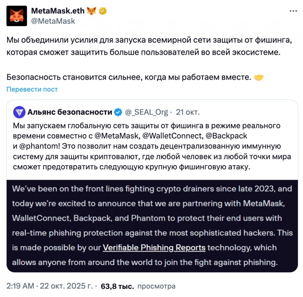 MetaMask, Phantom и другие крупные криптокошельки объединились с Security Alliance (SEAL) для запуска глобальной сети защиты от фишинга. Это решение было принято после того, как в первой половине 2025 года криптофишеры похитили более $400 млн.