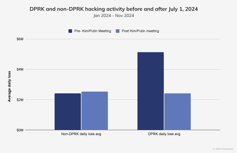 Согласно данным аналитической блокчейн-компании Chainalysis, незаконная активность, связанная с северокорейскими киберагентами, резко сократилась после 1 июля 2024 года, несмотря на всплеск атак ранее в том же году.