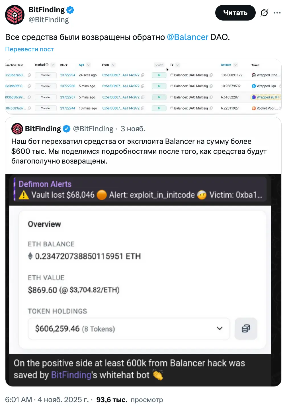 Balancer предложил вознаграждение в размере 20% по схеме белого хакера как этичным исследователям безопасности, так и злоумышленнику за возврат похищенных средств. На момент написания статьи вознаграждение никто не получил.