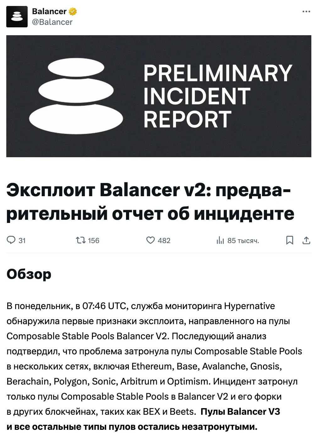 Команда протокола децентрализованного финансовирования Balancer опубликовала в среду предварительный отчет с подробным разбором причин инцидента, в результате которого было изъято $116 млн на рынках DeFi.