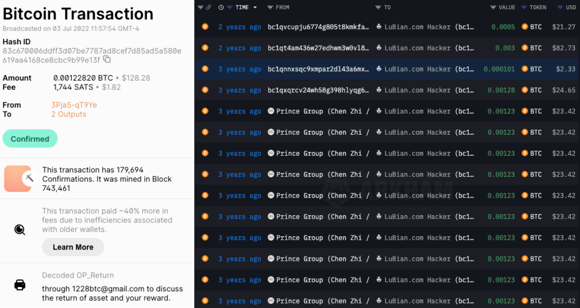 В отчете CVERC также говорится, что Чжи и его группа Prince Group неоднократно отправляли сообщения на адрес хакера посредством биткоин-транзакций на сумму около 23 долларов каждое, умоляя вернуть украденные BTC и предлагая вознаграждение, но не получили ответа.
