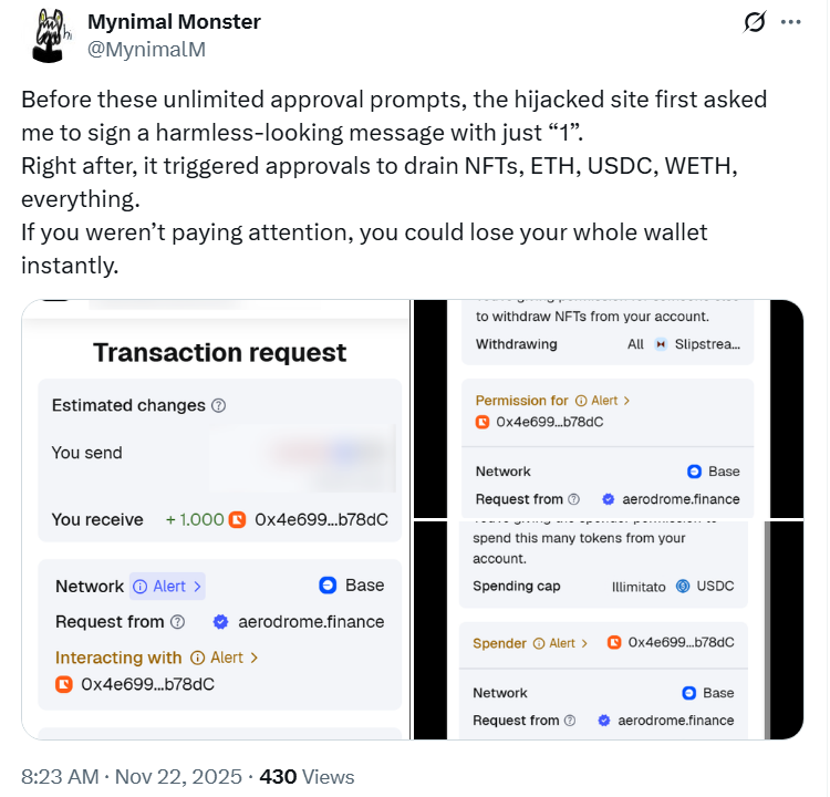 Пользователи столкнулись с двухэтапной атакой: сначала злоумышленники запрашивали безобидную подпись с цифрой «1», затем сразу запускали бесконечные запросы на вывод NFT, ETH и USDC.