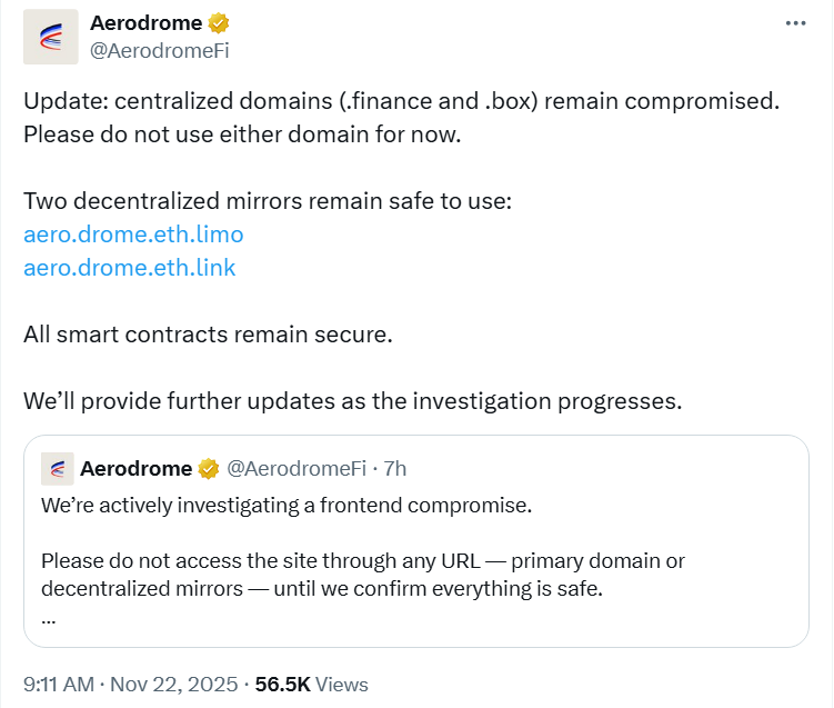 В ходе расследования выяснилось, что оба централизованных домена остаются под контролем злоумышленников. Команда оперативно развернула два безопасных децентрализованных зеркала на инфраструктуре ENS: Aero.drome.eth.limo и Aero.drome.eth.link.
